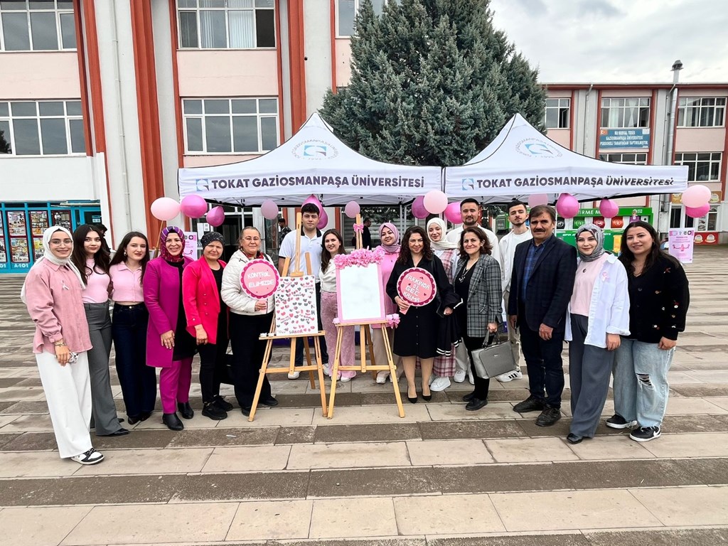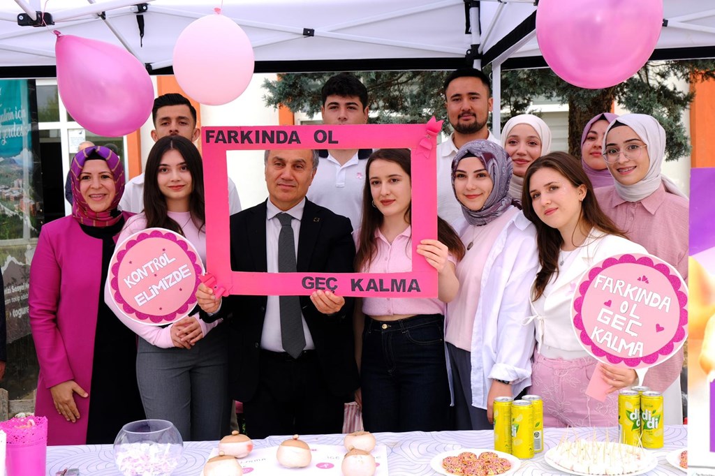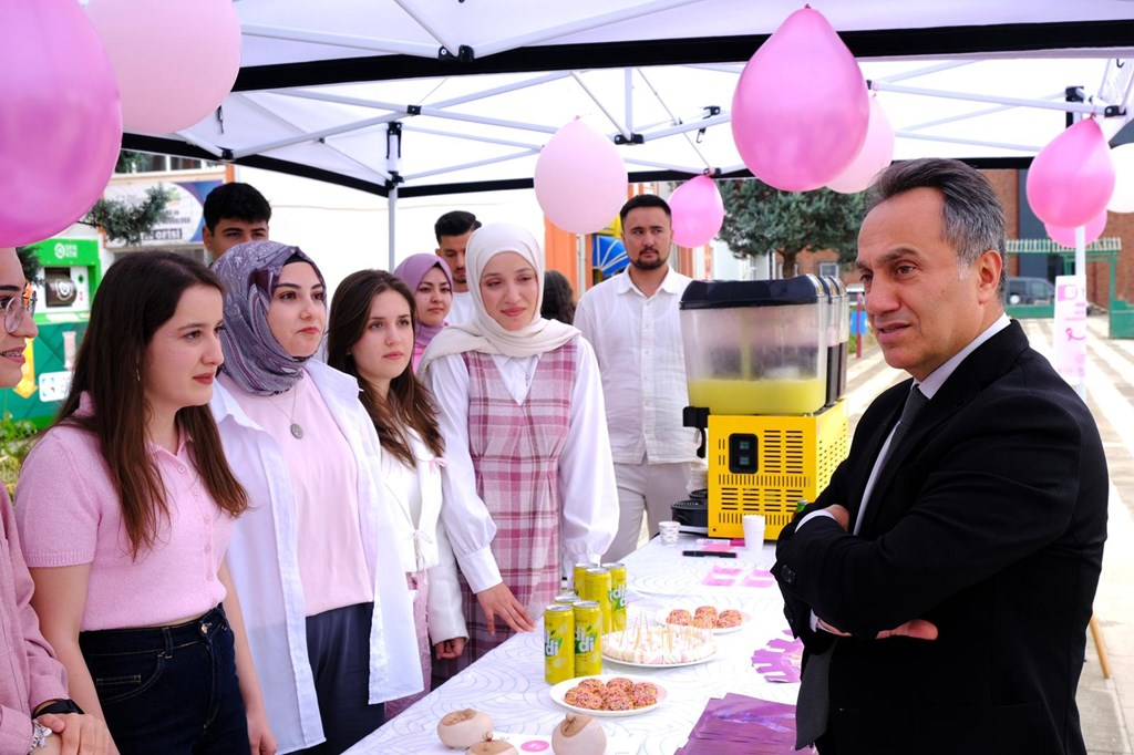 1–31 Ekim Meme Kanseri Farkındalık Ayı kapsamında “Pembe Ayna: Meme Kanseri Farkındalık Etkinliği” düzenlendi. Sağlığı Koruma ve Geliştirme Kulübü (SAKOR) tarafından gerçekleştirilen etkinlikte, meme kanserinde erken teşhisin önemi üzerine bilgilendirmeler yapıldı. Rektörümüz Prof. Dr. Fatih Yılmaz, etkinlik alanını ziyaret ederek kulüp üyeleri ve akademisyenlerden bilgi aldı. Dr. Öğr. Üyesi Tuğba Solmaz ve SAKOR Kulübü öğrencileri, etkinliğin amacı ve erken teşhisin yaşam süresi üzerindeki etkileri hakkında açıklamalarda bulundu. Rektörümüz Prof. Dr. Fatih Yılmaz, farkındalık çalışmalarının önemine dikkat çekerek şu ifadeleri kullandı: “Meme kanseriyle mücadelede erken teşhis en güçlü silahtır. Üniversitemizde bu bilincin artırılmasına katkı sunan tüm öğrenci ve akademisyenlerimizi tebrik ediyorum.” Merkezi Yemekhane önünde 11.00–14.00 saatleri arasında süren etkinlikte öğrencilere, kadınlarda en sık görülen kanser türlerinden biri olan meme kanserine karşı düzenli tarama, kendi kendine muayene yöntemleri ve erken tanının önemi hatırlatıldı.